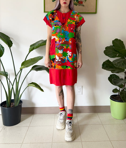 70s Psychedelic Primary Color Jungle Pals Sack Midi Dress