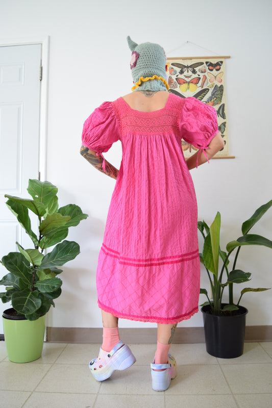 70s Pink Puff Sleeve Embroidered Maxi Dress - Medium