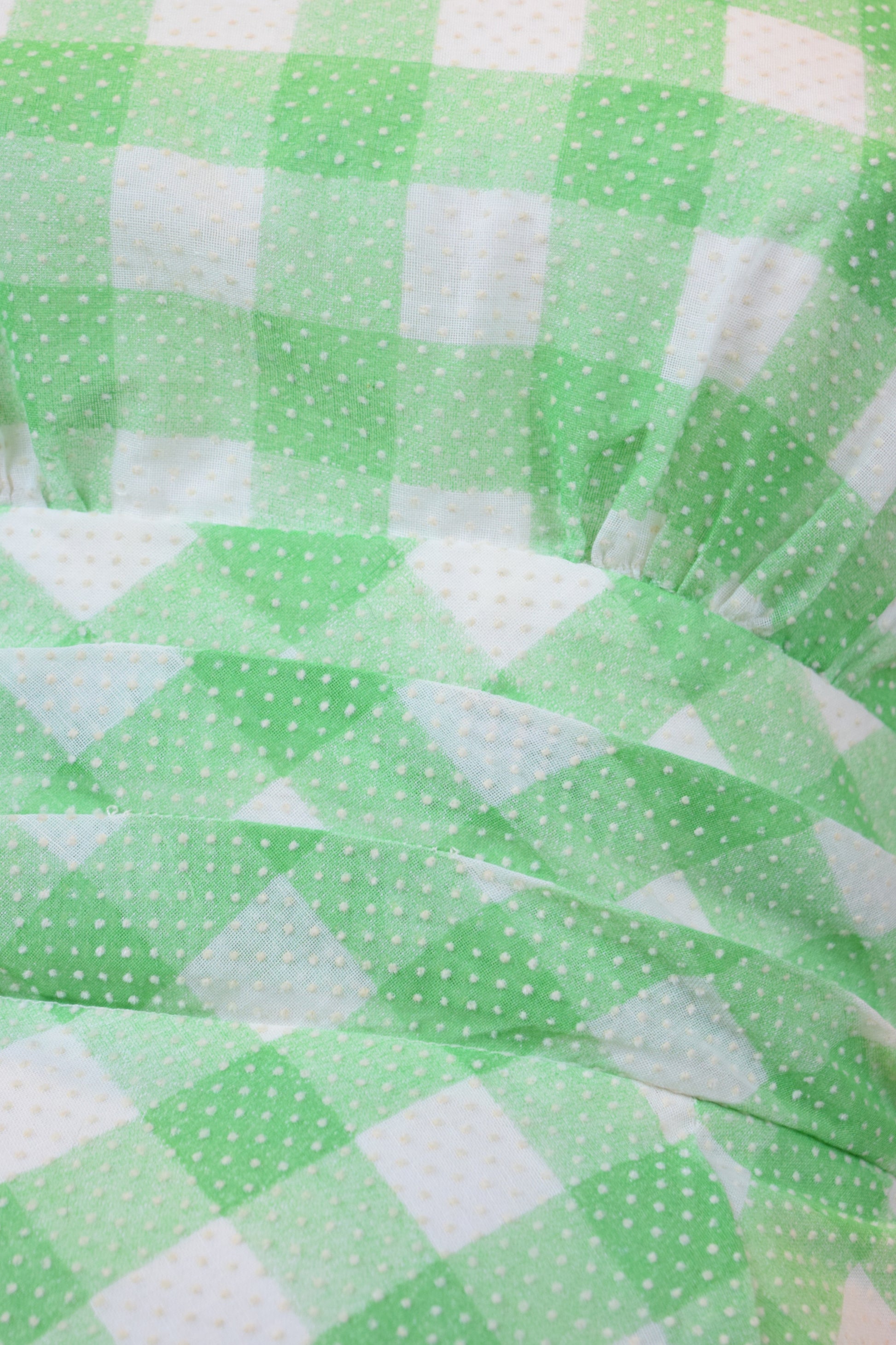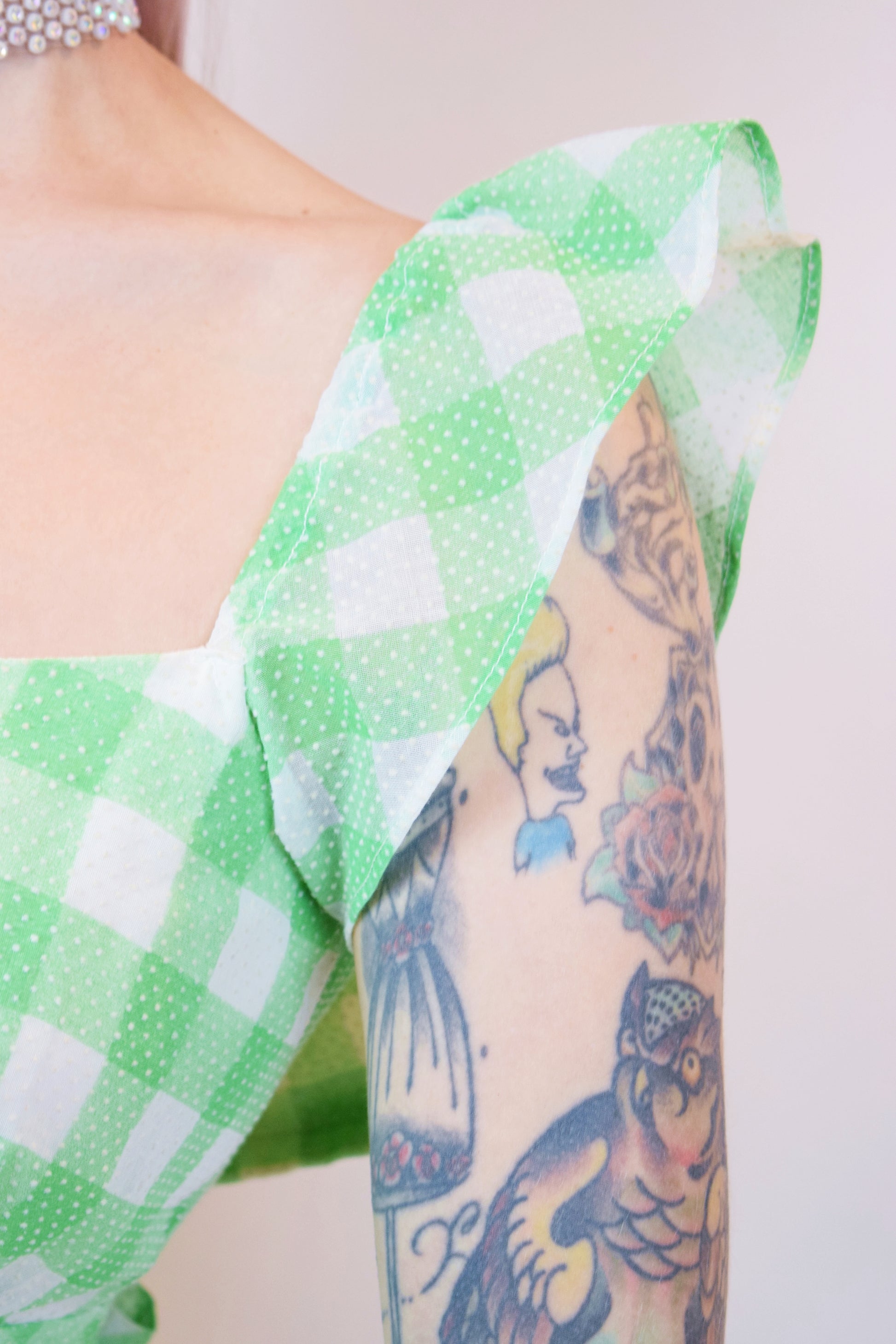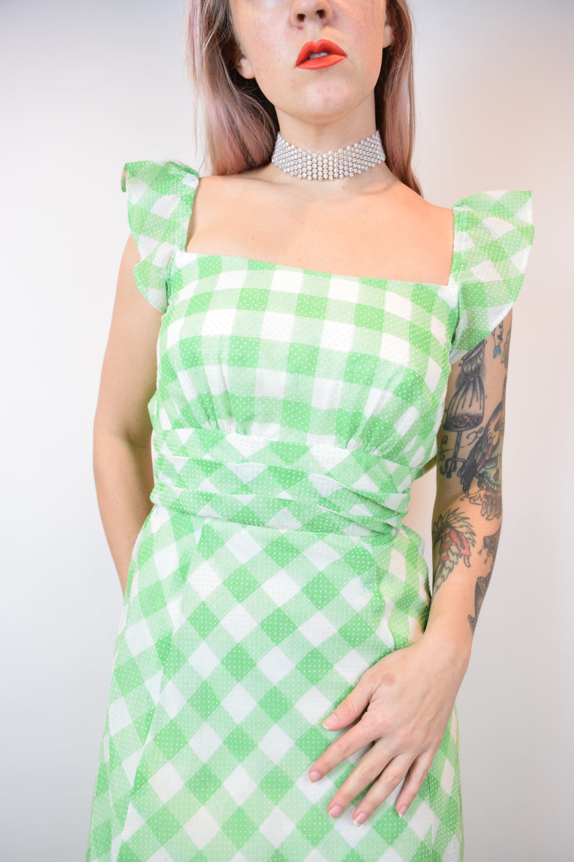 FREE US SHIPPING! ๐ฑ๐๐ผ GORGEOUS 1960s true vintage mint green and white maxi dress. Textured micro polkadot pattern over checkerboard pattern. Puffy ruffle sleeves. Zips up the back with a bow that buttons over zipper. Ruffle finish maxi skirt. No stretch to fabric. Original metal zipper has been replaced. In great vintage condition!