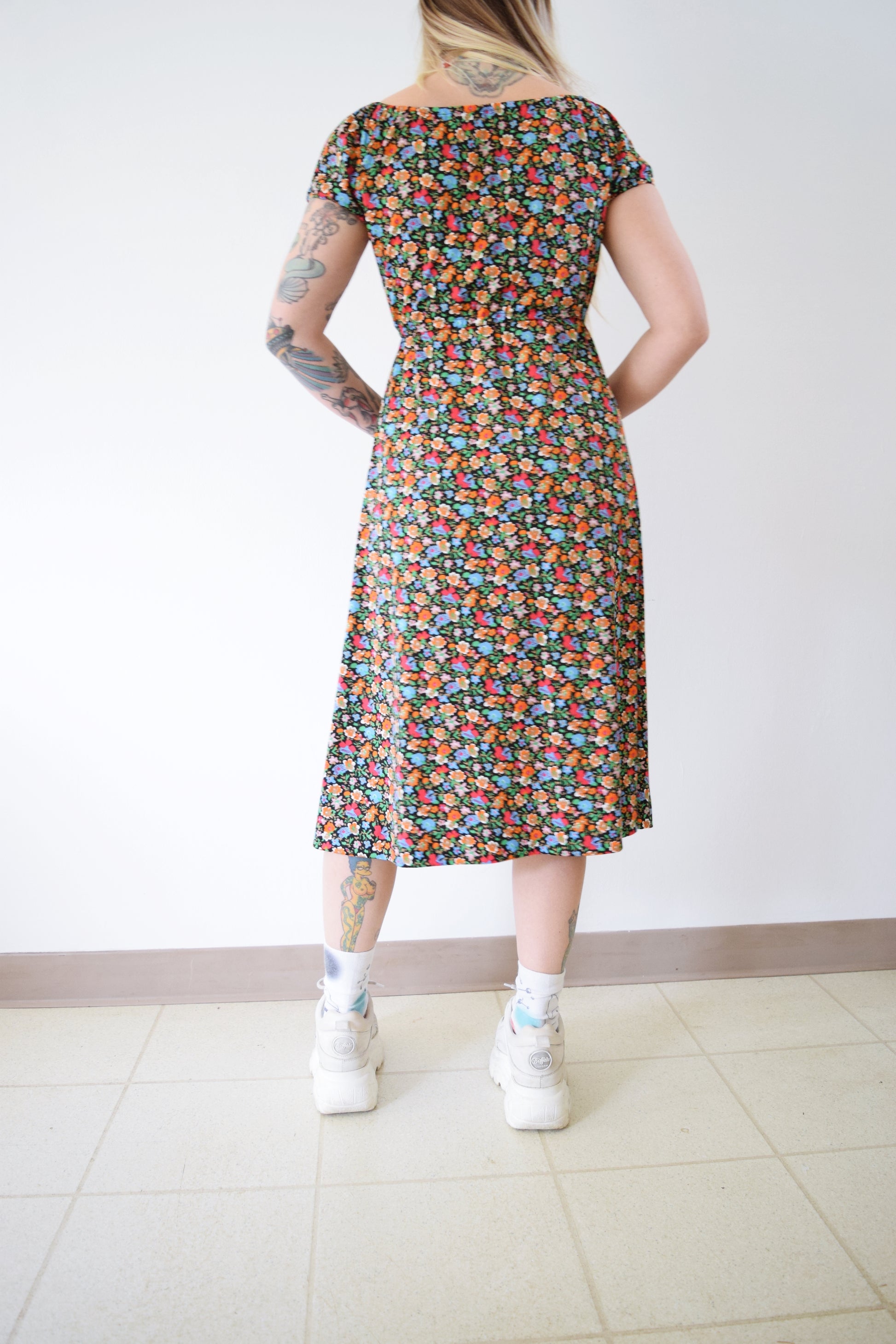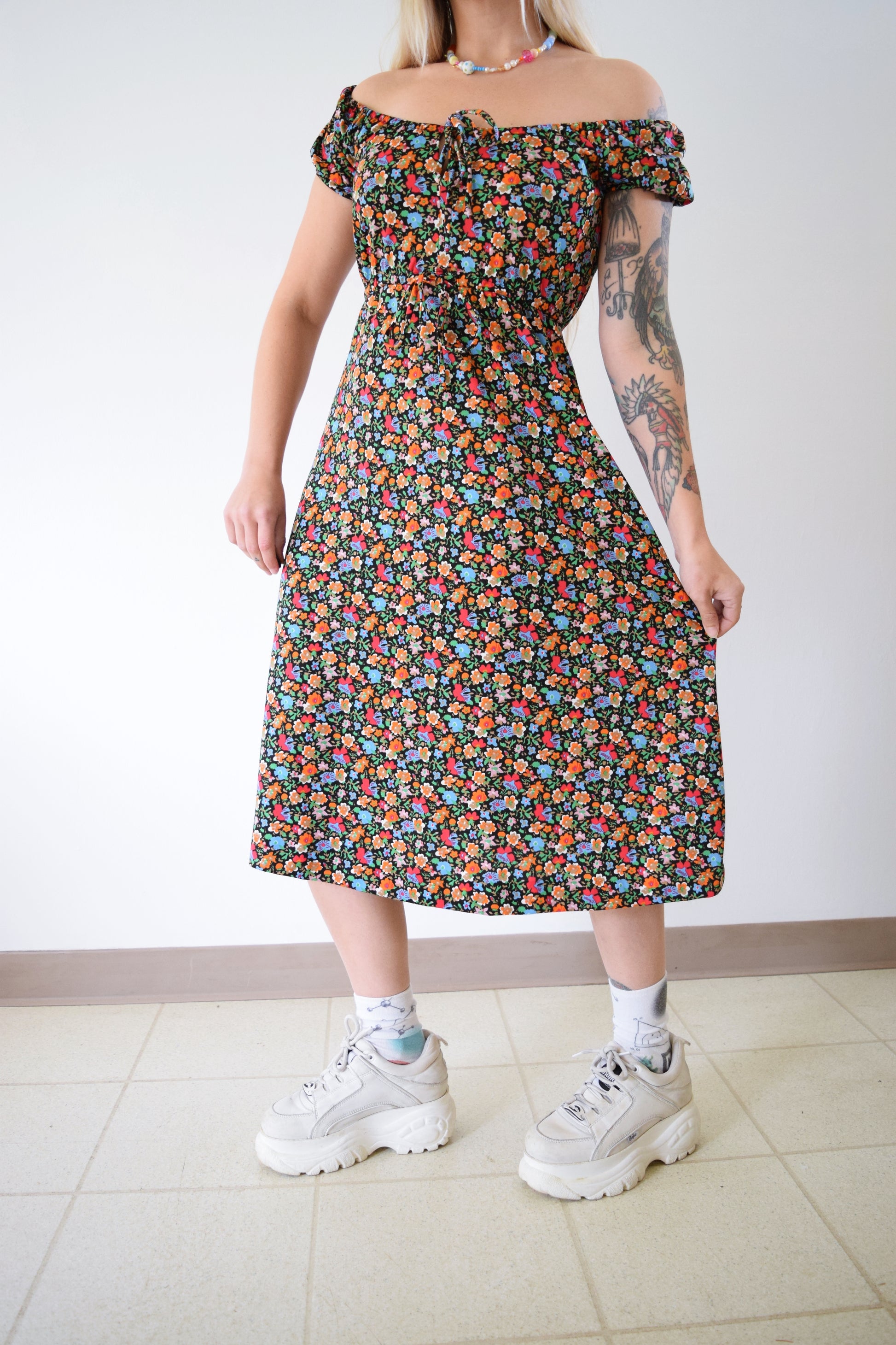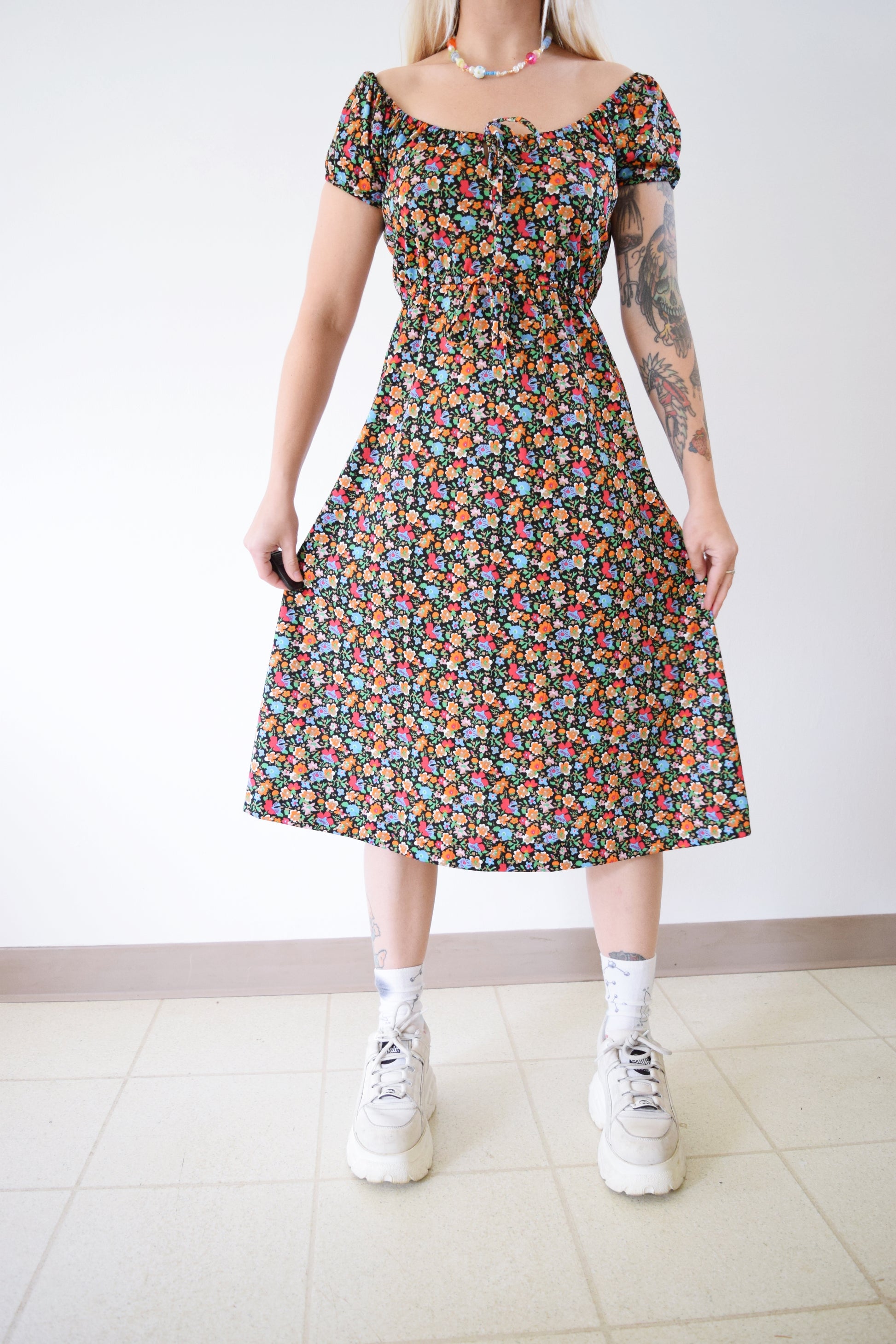 FREE US SHIPPING! ššø Union made 1960s midi dress with a colorful psychedelic day glow floral patter. Elastic waistband. Ties at bust and waist. Elastic neckline. Sleeves can be worn off the shoulder. Playful skirt. So flowy and comfy. In great vintage condition!