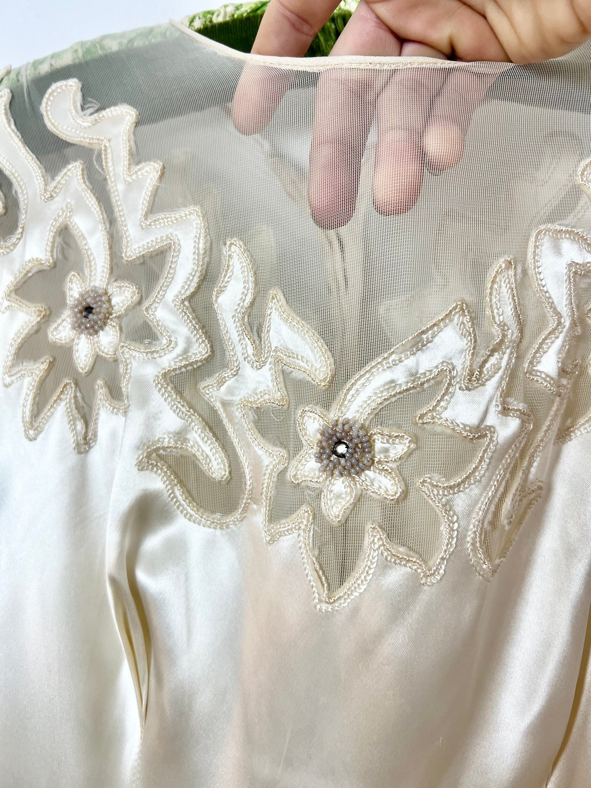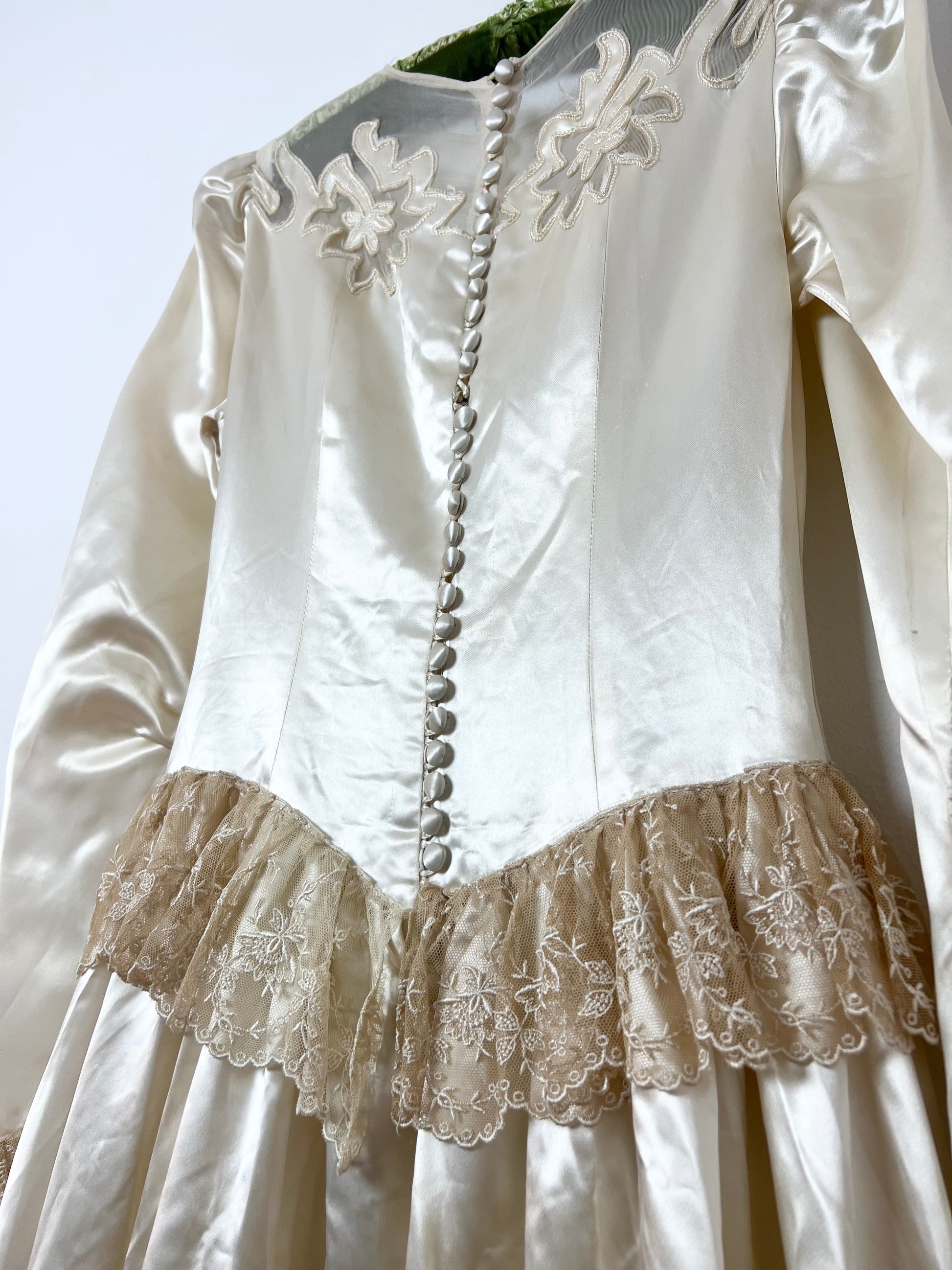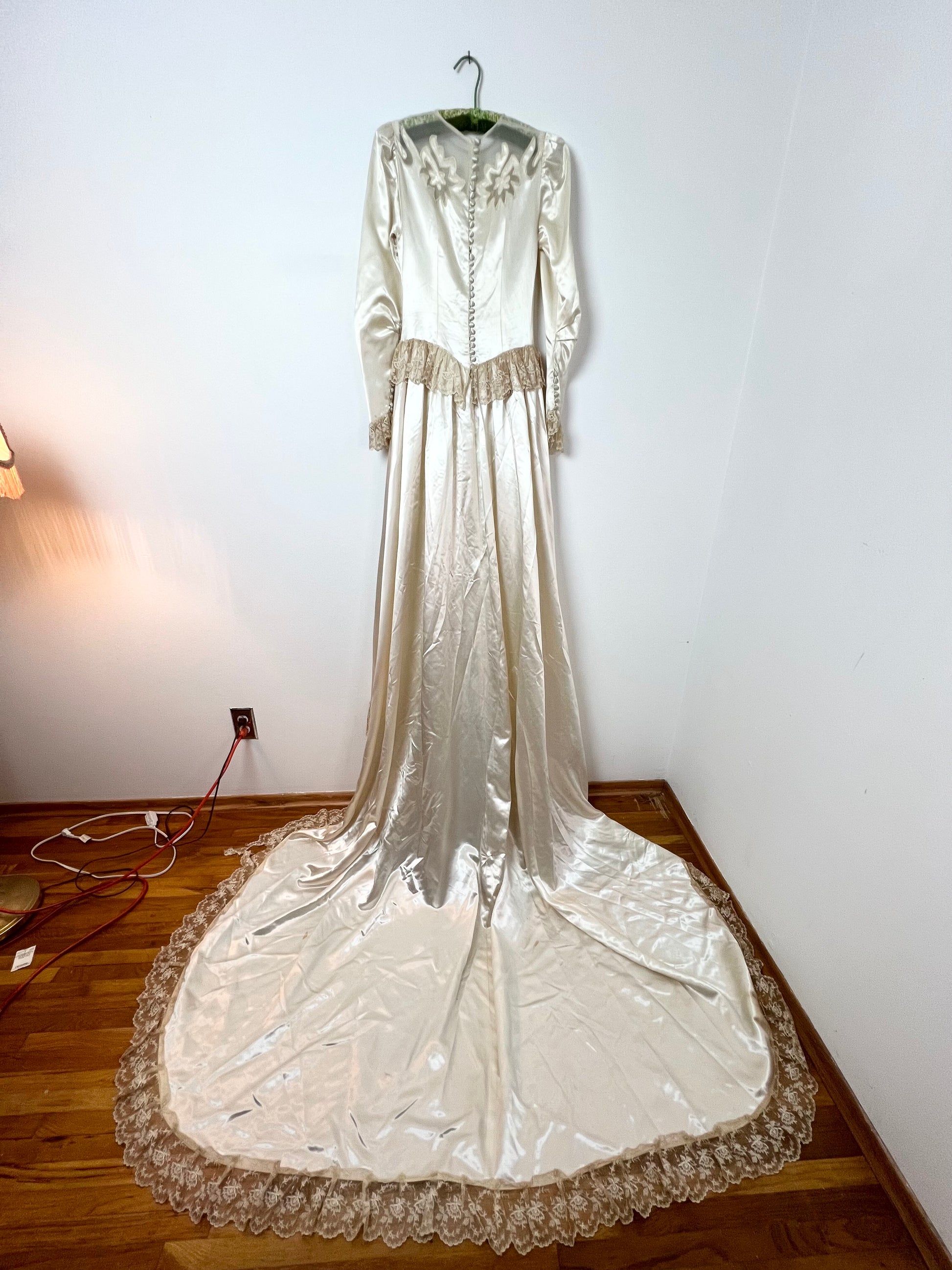Darker cream lace peplum trim around waist with matching trim on sleeve cuffs and skirt. Huuuuuge train. A few spots here and there. Haven't spot treated yet. Intricate beading and chain stitch embroidery designs along bust and back.