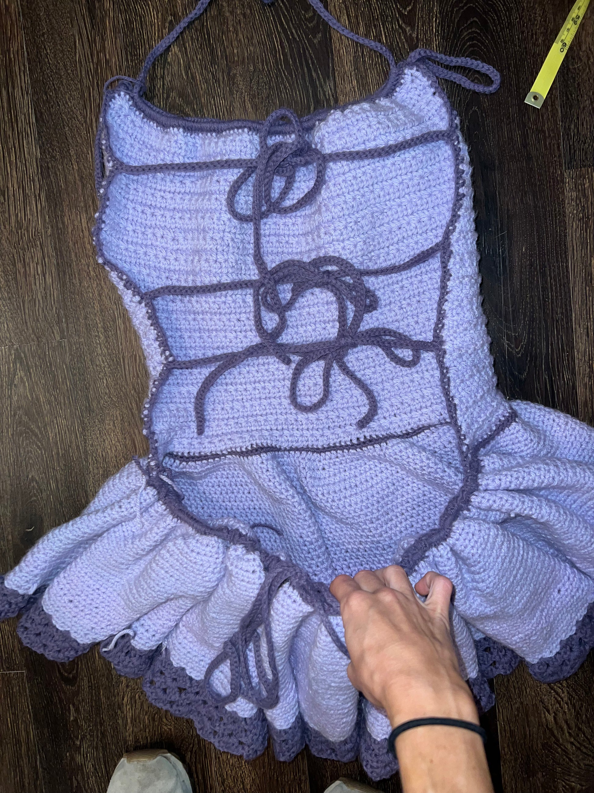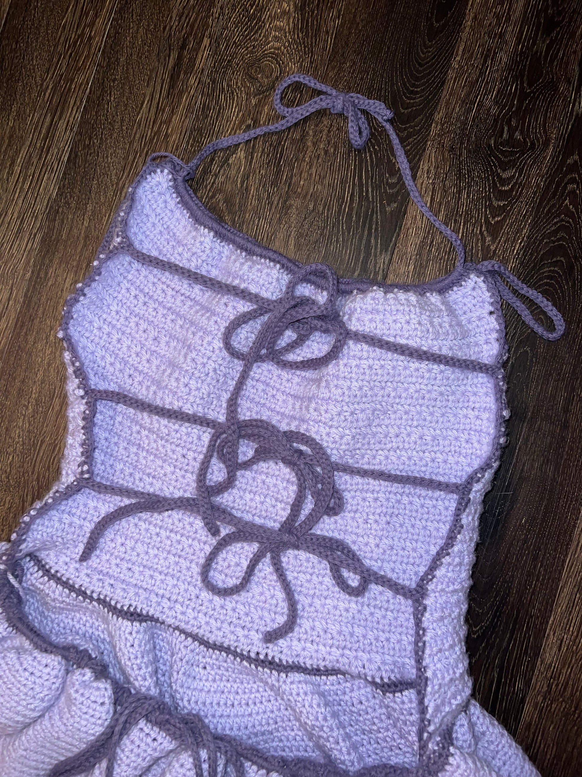 Omgggggg this is so cute!!! Handmade! Hand knit!! Pastel purple and darker purple colorway micro mini balletcore dress. Halter ties around neck. 2 lil bow ties at straps. Full skater skirt. Back is open and has 3 ties. Waist is adjustable with drawstring.
